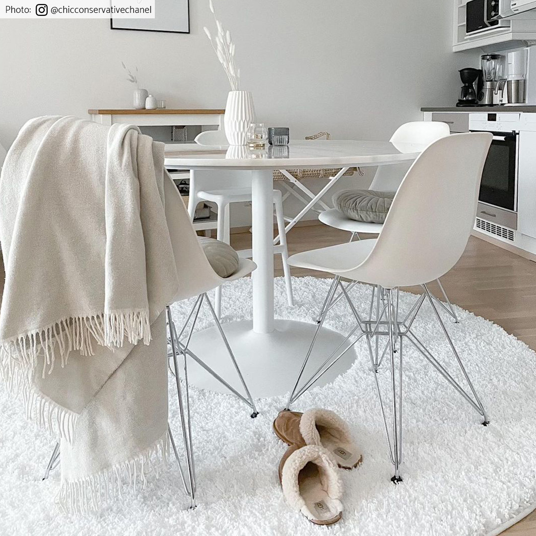 Ryijymatto Trim lyhyellä ja tiheällä haivenella, tässä pyöreän muotoisena. Kiiltävät langat vuorottelevat yksivärisessä matossa, luoden elinvoimaisen ja virtaavan ryijymaton. Anna jalkojesi laskeutua pehmeälle ja mukavalle matolle kävellessäsi kodikkaalla ryijymatolla. Matto istuu mainiosti keittiönpöydän alle, kuten myös olohuoneen tai lastenhuoneen matoksikin. Tässä matto värissä valkoinen.